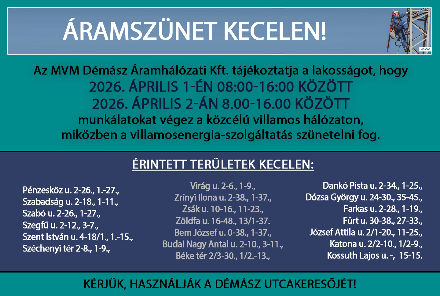 Áramszünet lesz Kecelen! - 2026. április 1-2.