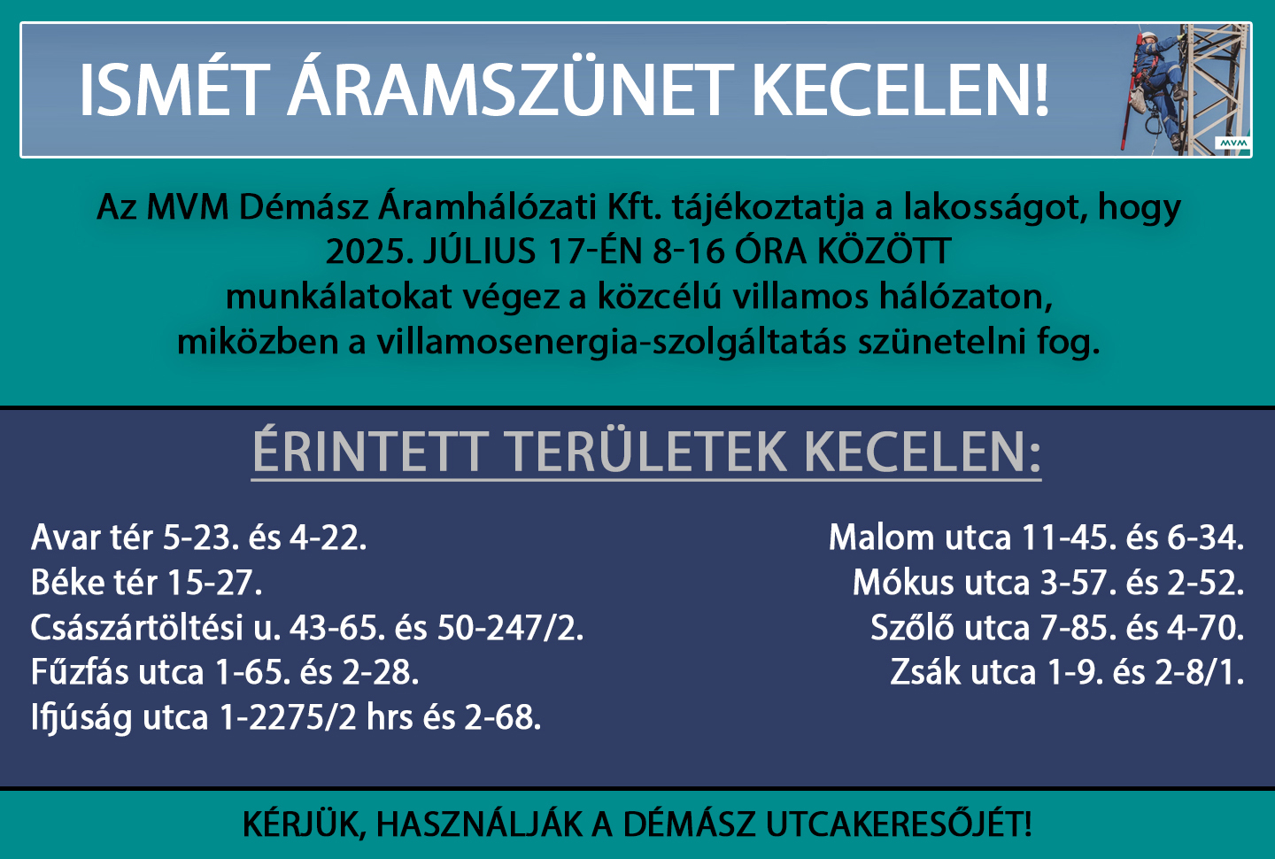 2025. július 17-én 8-16 óra között ismét áramszünet lesz Kecelen!