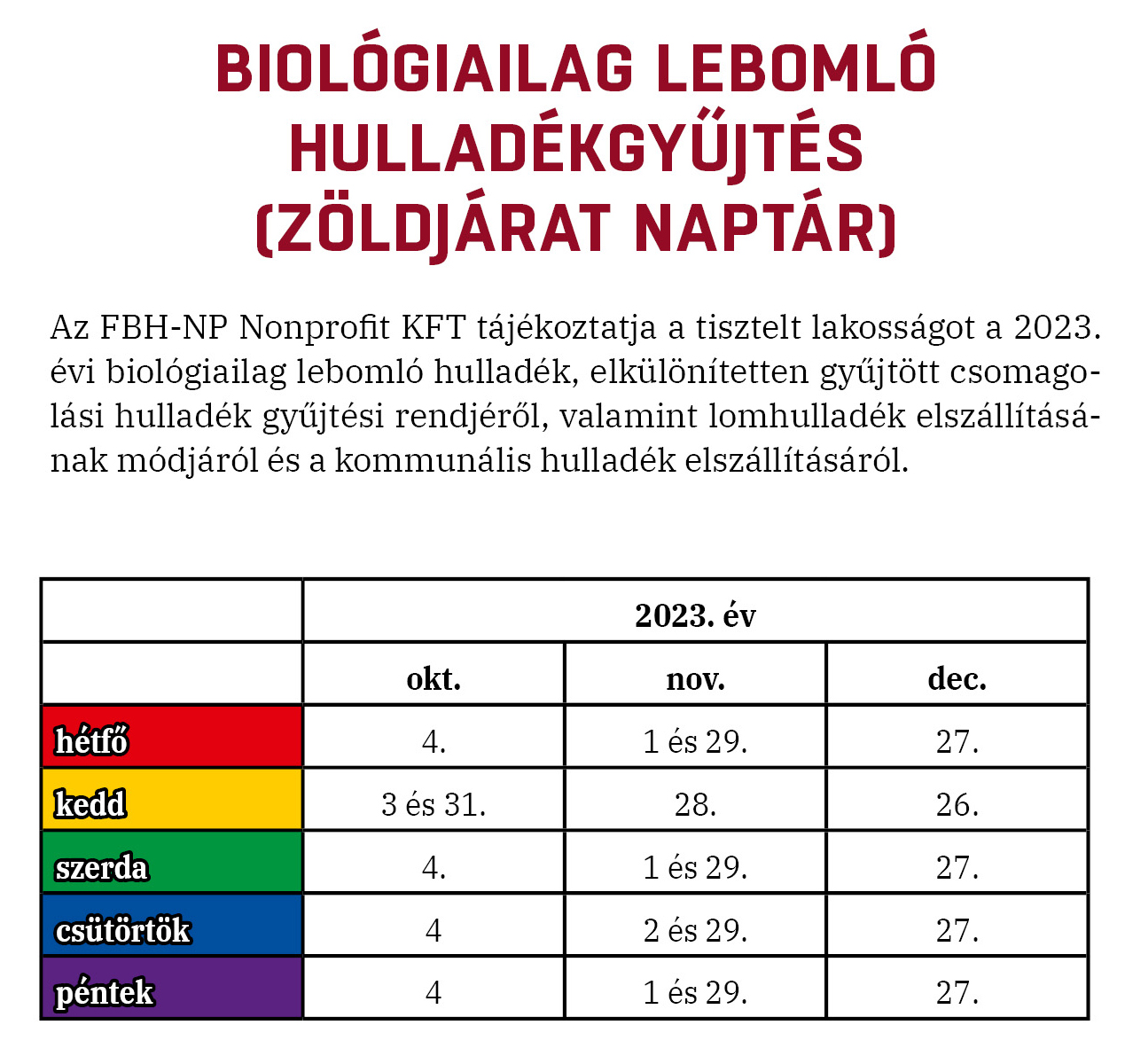 Zöldjárat naptár az év hátralévő részére: